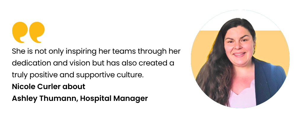 Ashley Thumann, Hospital Manager at Calvert Animal Hospital: "I want to take a moment to recognize Ashley for her exceptional leadership. She is not only inspiring her teams through her dedication and vision but has also created a truly positive and supportive culture. Ashley’s ability to lead with empathy, consistency, and enthusiasm is making a lasting impact. Her teams feel empowered, valued, and motivated—and that’s a direct reflection of the environment she’s built."