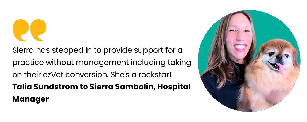 Talia Sundstrom from OPS wants to recognize Sierra Sambolin, Hospital Manager, Hidden Hills Animal Hospital: "Sierra has stepped in to provide support for a practice without management including taking on their ezVet conversion. She's a rockstar!"