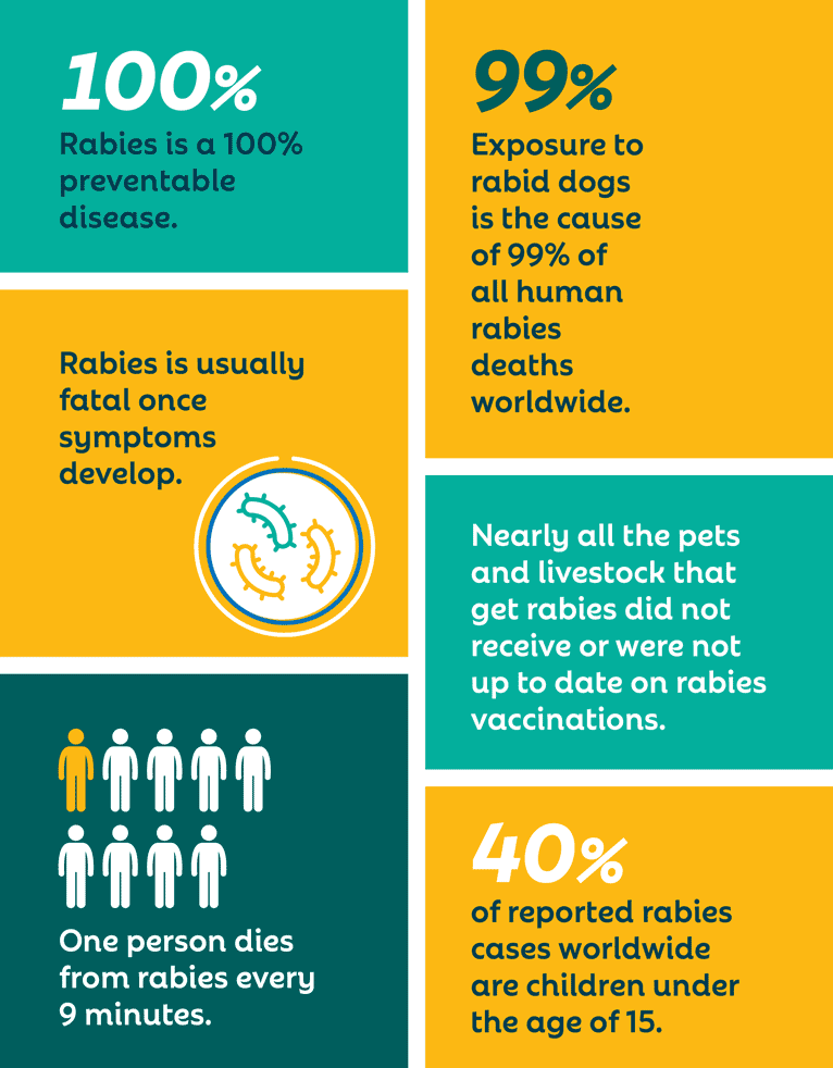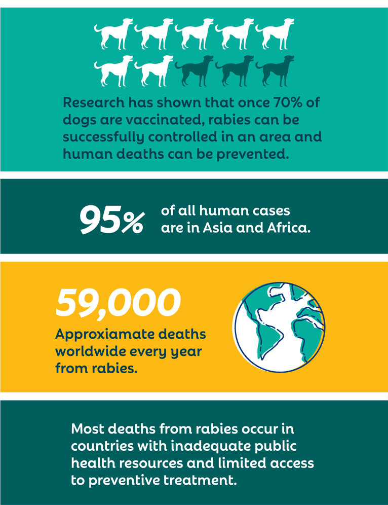 Major health organizations including the Centers for Disease Control and Prevention, the United States Department of Agriculture (USDA), World Health Organization (WHO), the World Organization for Animal Health (WOAH), and the Food and Agriculture Organization of the United Nations (FAO) are working together to eliminate rabies deaths in people by 2030. We have the vaccines, medicines, tools, and technologies to prevent people from dying from dog-mediated rabies. For a relatively low cost, it is possible to break the disease cycle and save lives.