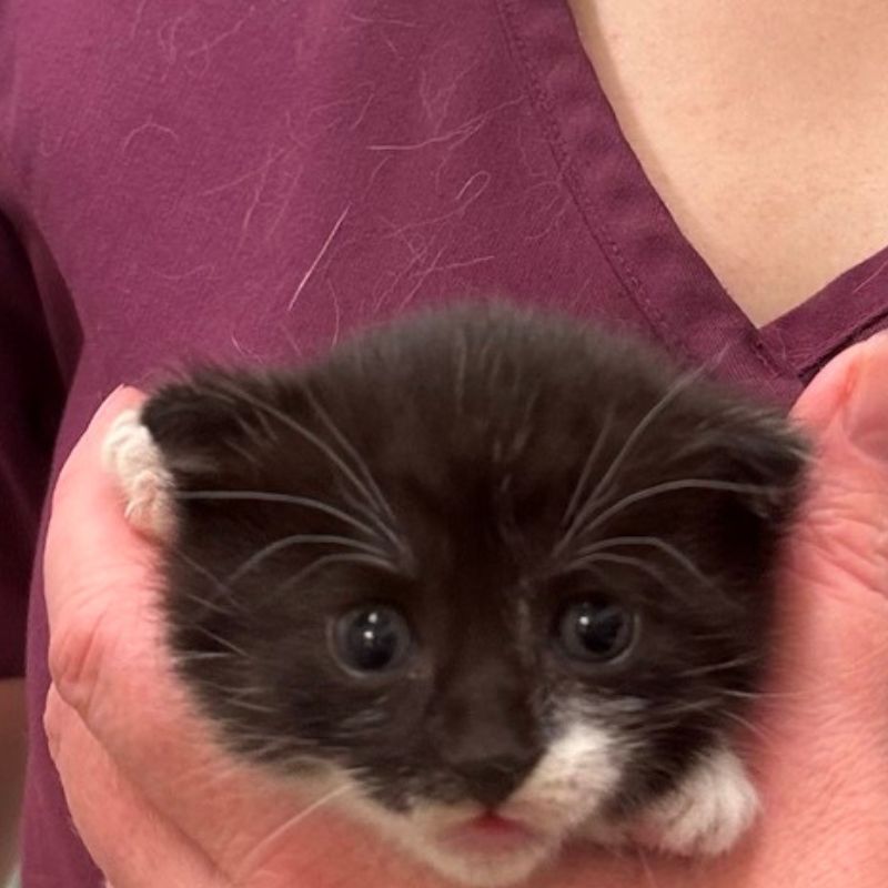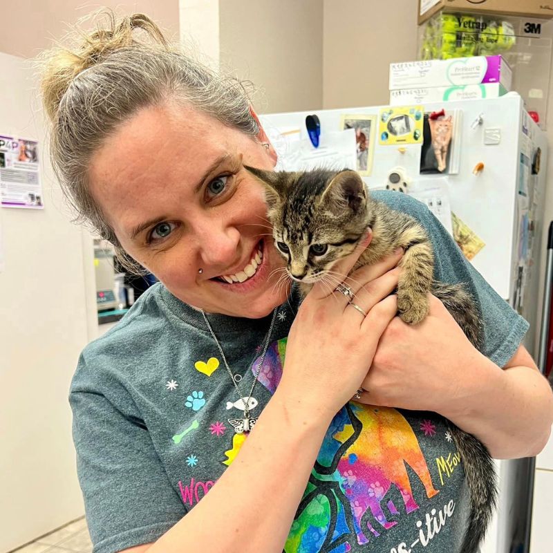 Veterinary assistant Allyssa from Bartels Pet Hospital stopped on the way to work when she saw something in the middle of an intersection. She quickly realized it was a very small kitten. She took her to work where the team was able to take care of her. The kitten was approximately 3-4 weeks old and weighed just 8 ounces. Allyssa has adopted the kitten and named her Dyna. Once hungry and scared, Dyna is now surrounded by love and thriving in her new home!