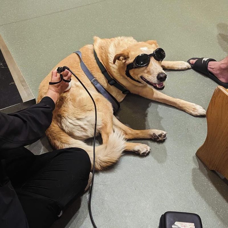 Meet James Dean the doggo who bears an amazing resemblance to the human James Dean when he wears his protective goggles. The fact that he exudes the same charisma as the movie star is part of why James Dean is a fan favorite at Highlands Animal Clinic. His routine laser treatment helps with the pain and inflammation in his achy joints. Not everyone can be James Dean, but any pet that is arthritic or achy post-op may find relief with laser treatment just like he does
