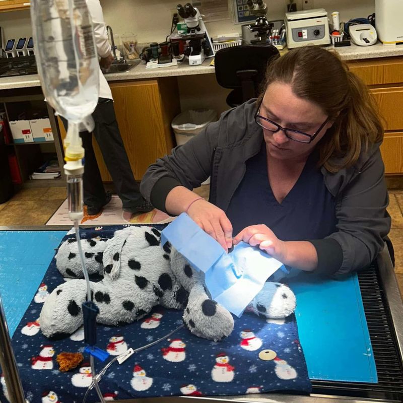 At Portage Veterinary Clinic, the team goes above and beyond for their clients, even taking care of the occasional stuffed animal pet that needs a little TLC. Rhea, one of the veterinary technicians, had a very important surgery today on a very special patient. Puppy came in after losing his eye, and the team decided to attempt an eye transplant. It was a success! Puppy is recovering well and staying at the hospital, his owner can’t wait to pick him up and give him a big snuggle.