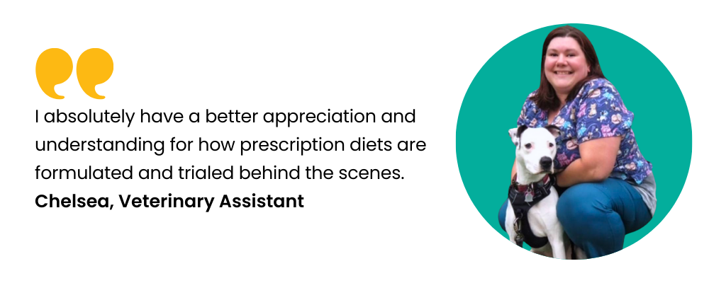 "I absolutely have a better appreciation and understanding for how prescription diets are formulated and trialed behind the scenes. There is a tremendous amount of time, brainpower, and manpower that goes into not only creating new diets but continuing to manage current diets. From nutritional balance to palatability to kibble size and crunchiness! Every variable is as important as the next for our pets! I'm not only feeling more prepared to field questions, but I'm also excited to share what I've learned! Often particular ingredients are targeted as either good or bad by mainstream media and being able to decode the "noise" for our clients will be invaluable."
