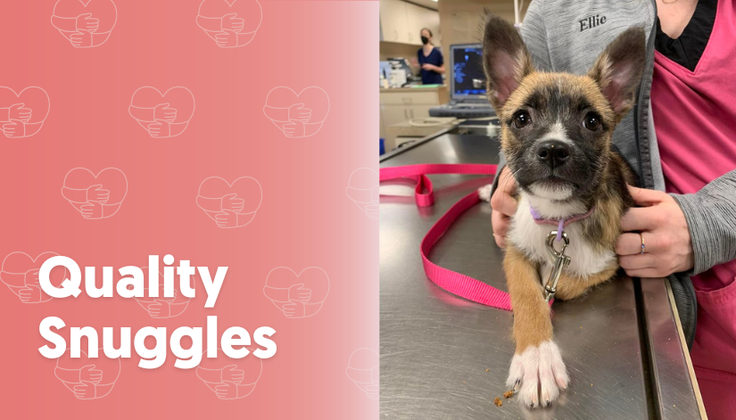 Eight-year-old Mickey was in for his dental assessment, treatment, and prevention procedure. He did great thanks to Lockridge Animal Hospital Vet Assistant, Risa, who carried him around in the “pooch pouch” after his procedure. She knows that Mickey is happiest when he is in someone’s arms.
