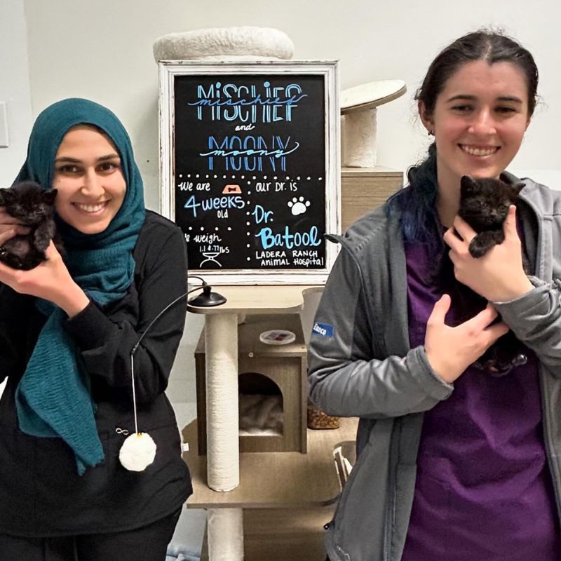 It might be hard to see the little balls of fur in this photo, but the team at Ladera Ranch Animal Hospital had no issues seeing and snuggling this pair. Mischief and Mooney, who are not even old enough for their vaccines yet, were in for a wellness check. Dr. Batool (left) and Dr. Amador (right) were happy to hold these two for their photo. Special shout out to Lucero, Miyoko, and Eimillee who illustrate the hospital’s first visit signs.