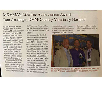 Congrats to Dr. Tom Armitage, Co-Chief of Staff at Country Veterinary Hospital in Mt Airy, MD, for being awarded the Lifetime Achievement Award by the Maryland Veterinary Medical Association. |